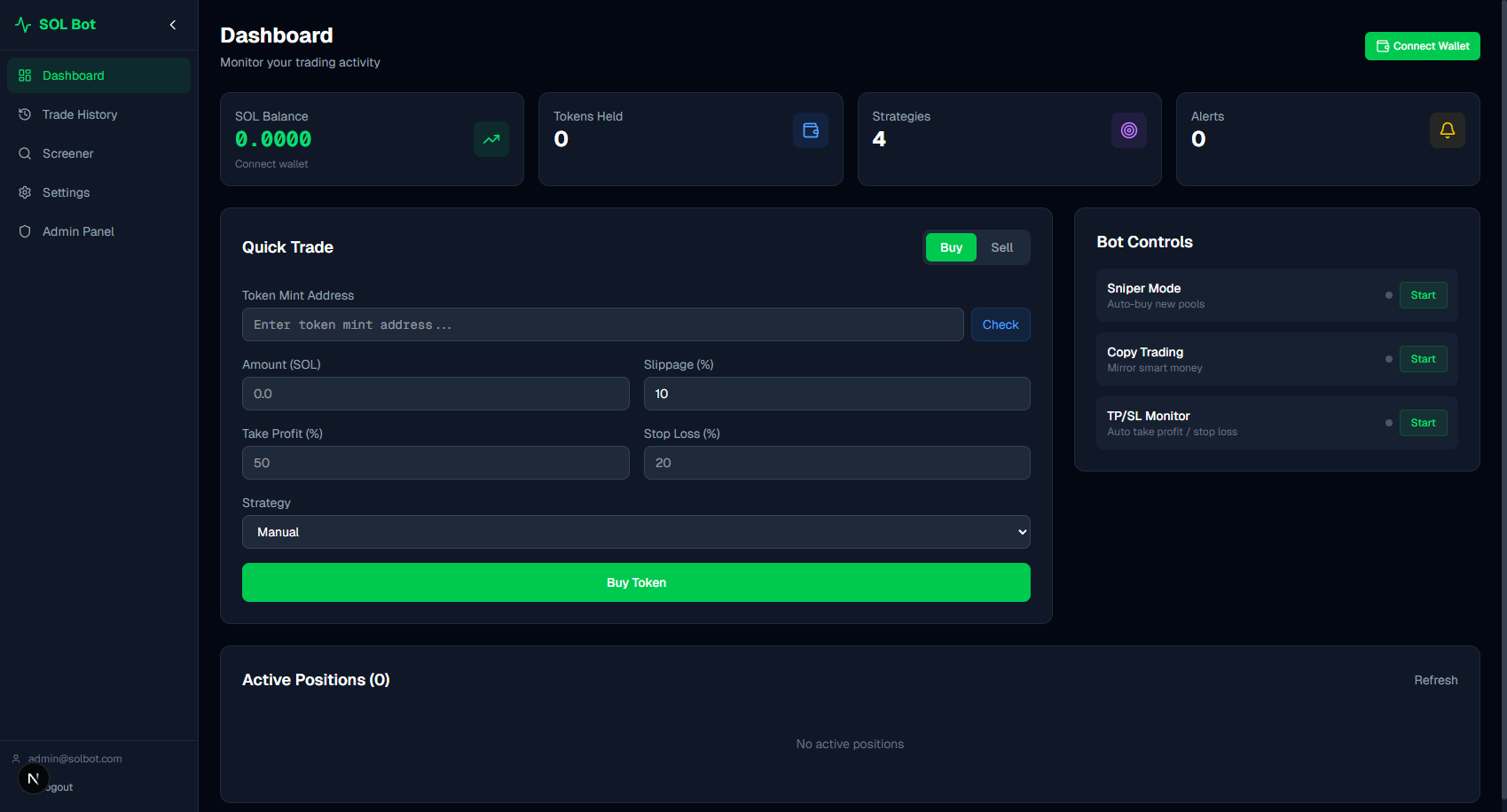 Bot trading otomatis Solana DEX dengan dashboard full-stack Next.js. Mendukung Raydium, Jupiter, dan Pump.fun dengan strategi trading multi-guna, screening anti-rugpull, dan manajemen posisi real-time.